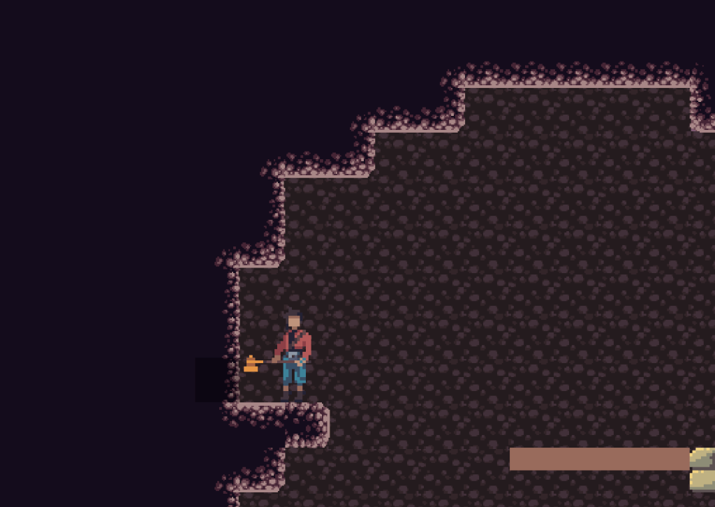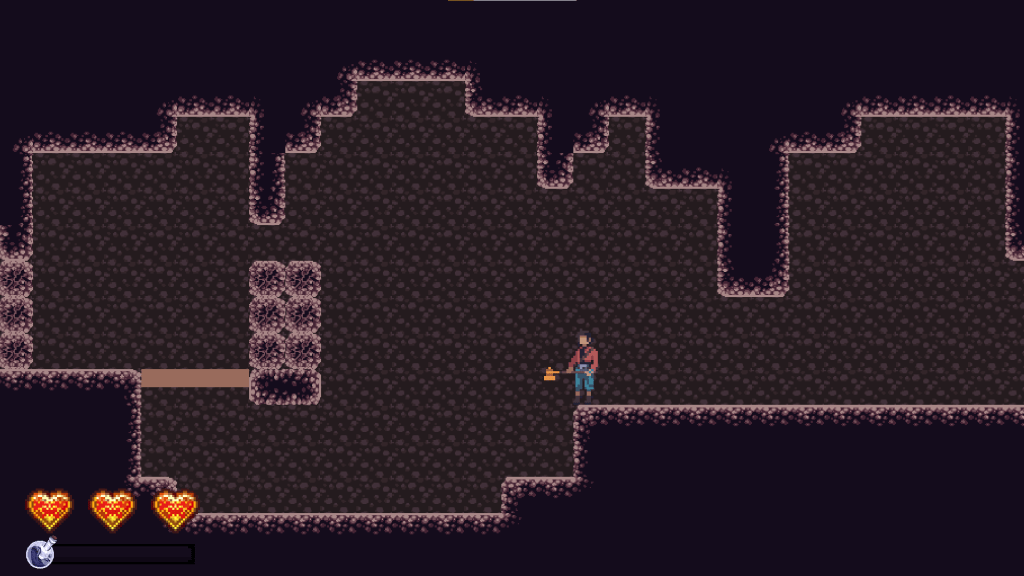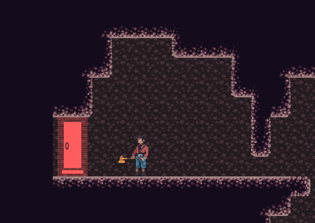 Here, we see some rocks that the player will naturally want to jump and attack. When they try to do that, they’ll find out that you can’t attack in the air. Originally, I had planned on including an aerial attack, but as the project progressed I realized that I didn’t have the time to implement it the way I wanted to, so I scrapped the idea for the purposes of this prototype. That makes it important for me to communicate that there is no aerial attack to the player, and this part of the room does just that. Additionally, if the player has read the README or played the game before, they might realize that they can roll under that one-block gap on top of the rocks. This makes the room flow really well and is a fun “Aha!” moment for players who’ve played the game before.