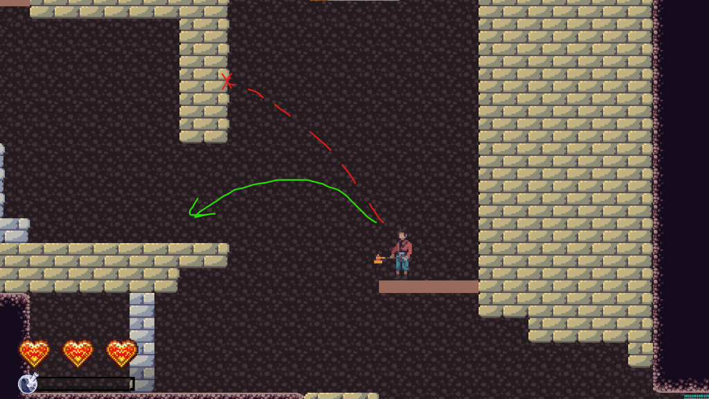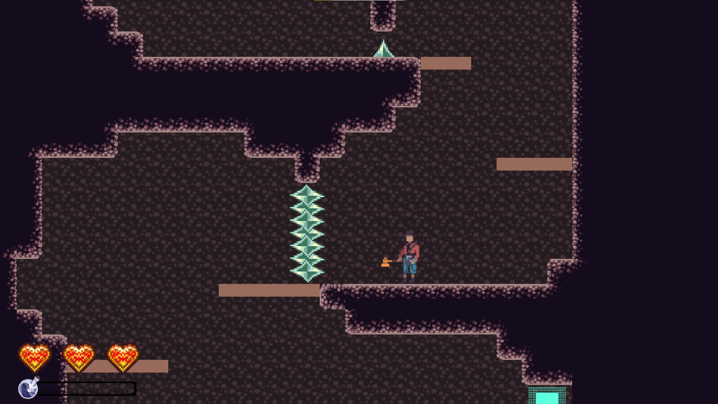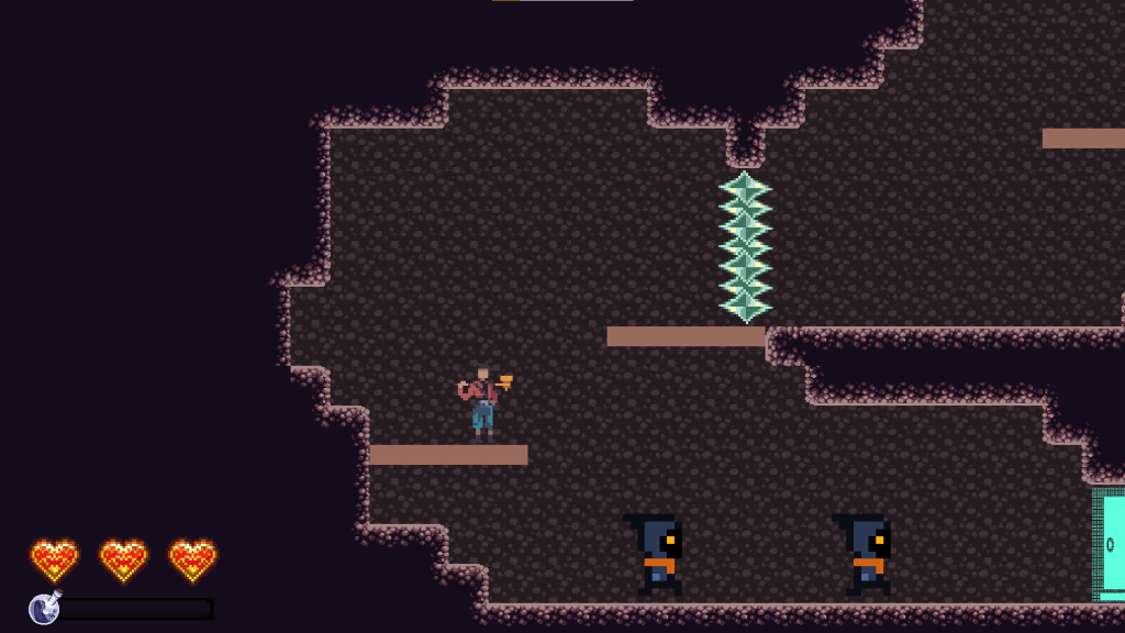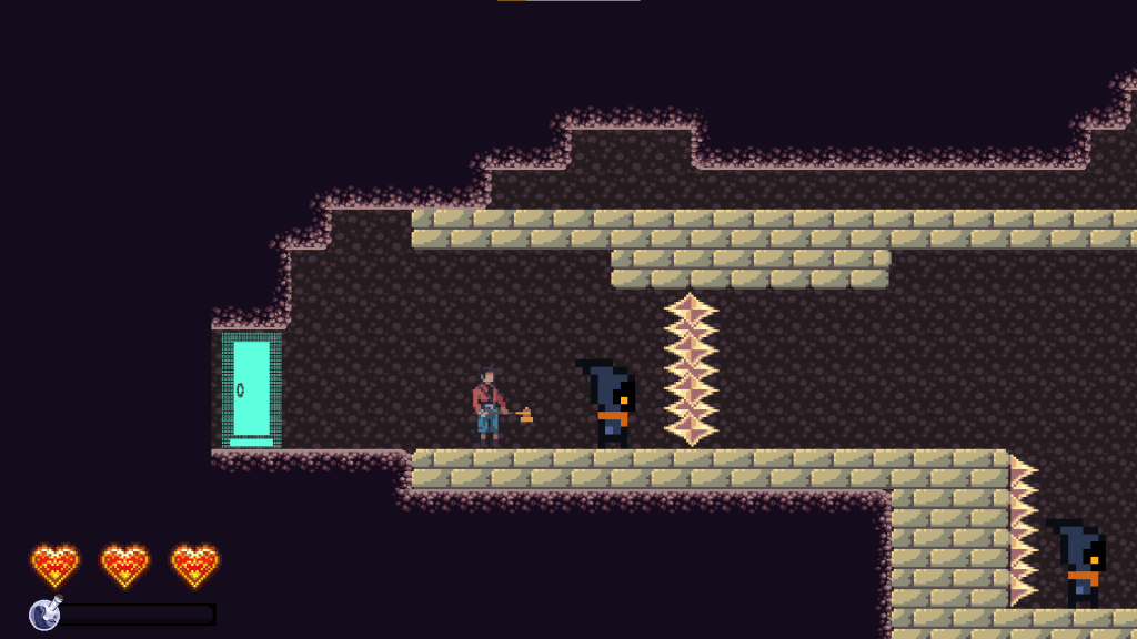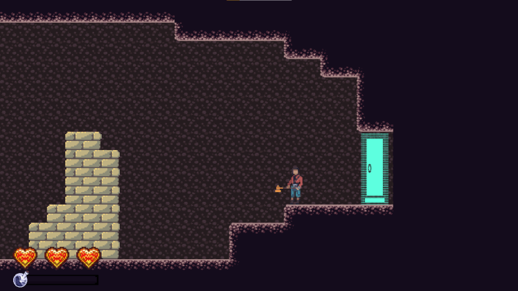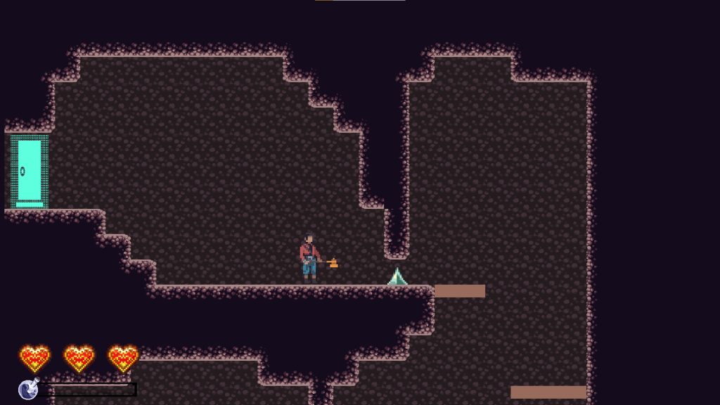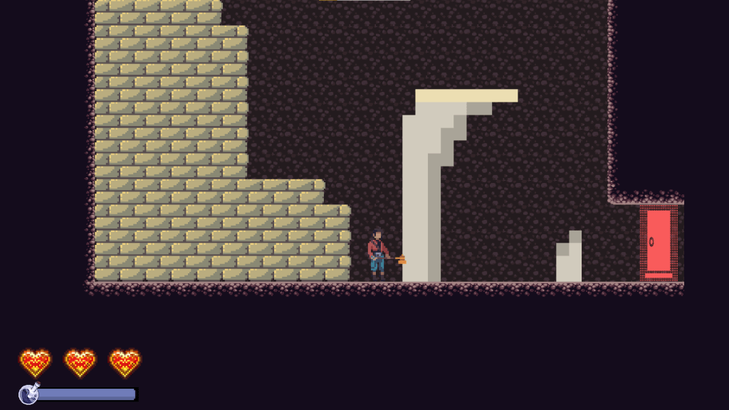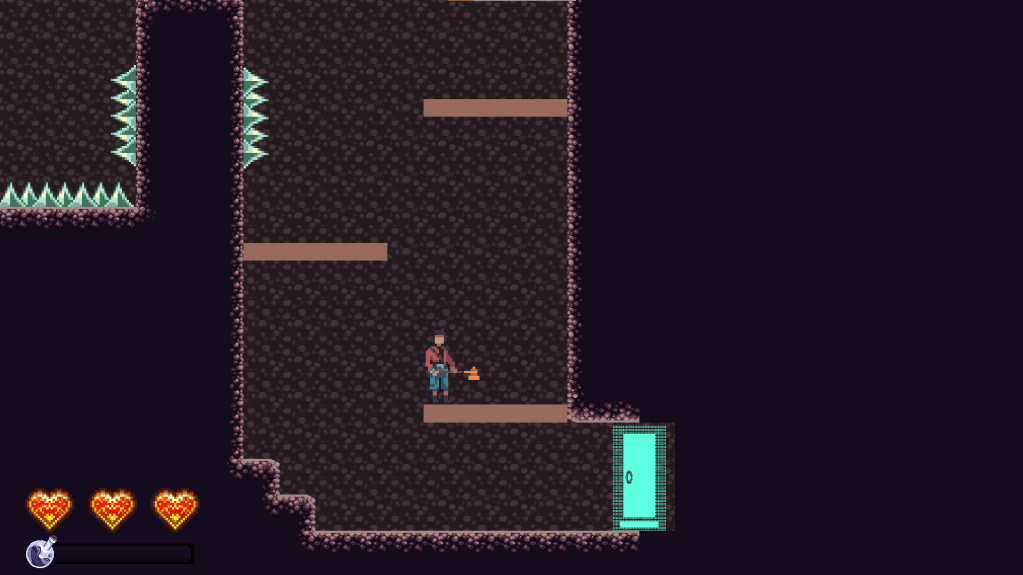 Further into the room, we have the first difficult jump in the game. It’s not pixel perfect by any means, but it tests their understanding of the jump mechanics and ensures that they realize you can jump higher by holding down the jump button.