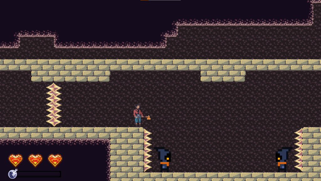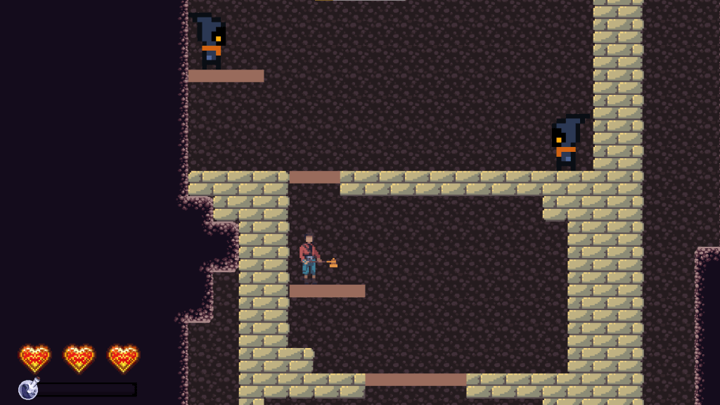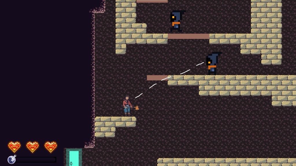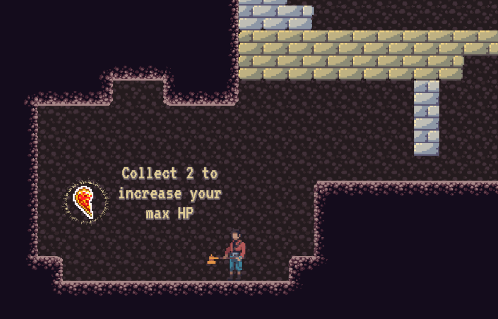 The next part of this room is designed to give the player a more full understanding of their jumping ability. First, they come to a jump where they’ll bonk their head if they hold down the jump button too long. This teaches them that sometimes they might not want a high jump. Then, they have to jump up this stack of stone bricks and jump up through a one-way platform. In order to do that, they have to get to the highest brick and jump as high as they can. This teaches them the limit of their jump height. Together, these jumps test the player’s knowledge by having them use a really short jump and the highest jump possible.