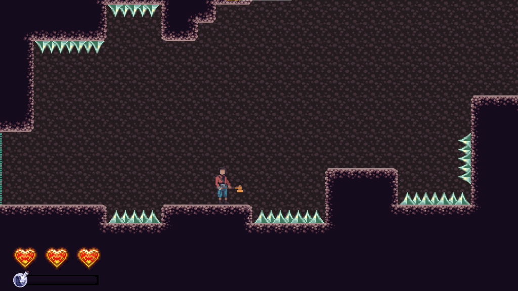 In the next room, the player is presented with a spike covering up a one-block opening. This teaches the player that their roll makes them invincible for a limited time. They may not want to roll through the gap since there’s a spike there, but by making that their only path forward I ensure that they can’t progress without learning that rolling gives them invincibility.